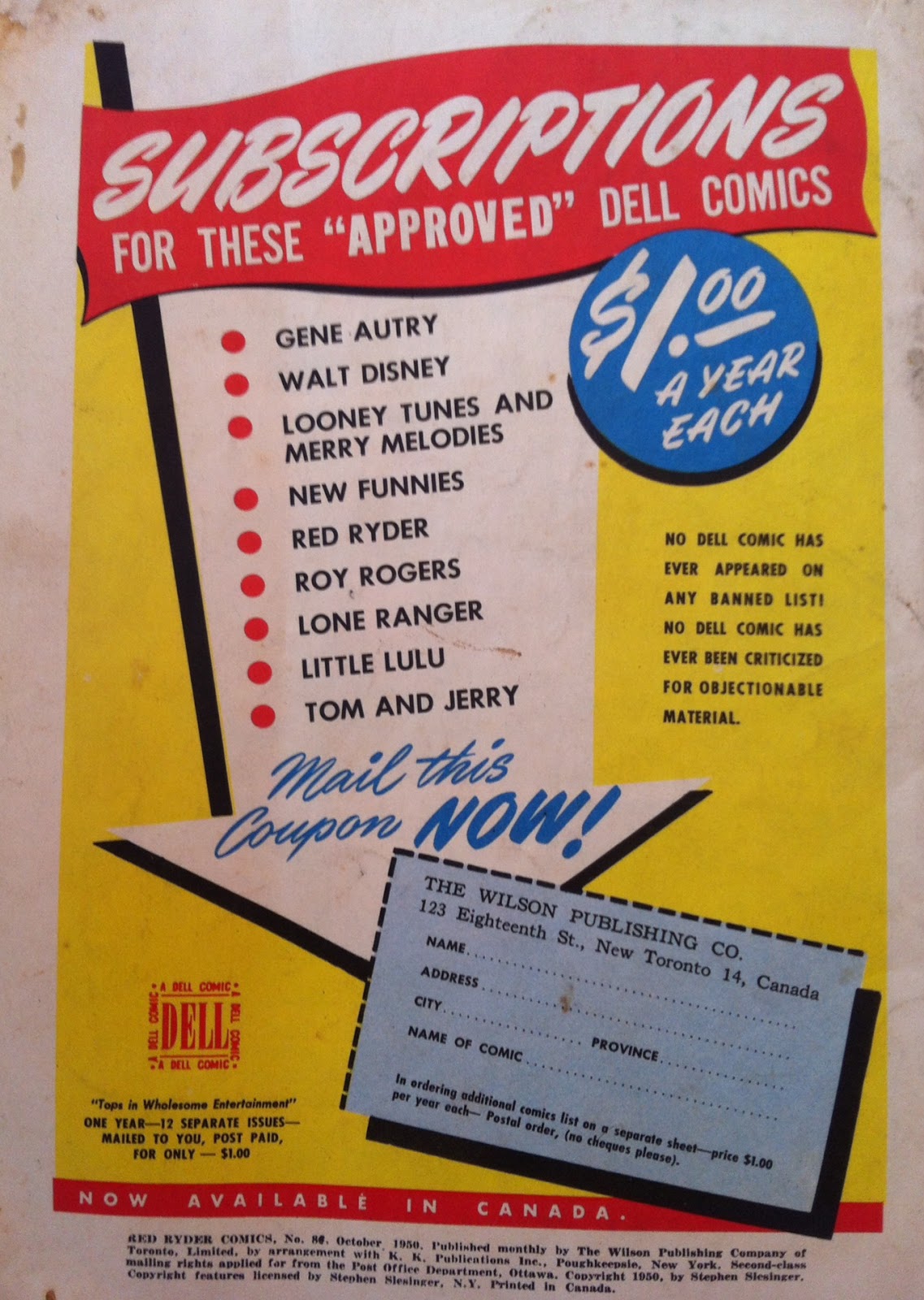 I bought this from a toy vendor this weekend not because I like these comics but because I don't have any of this particular type. You hardly see these Canadian editions of Dell Comics (I wish it was a Little Lulu!). Less pages than the U.S. issues and blank inside covers. Subscription coupon on the back cover. Published by The Wilson Publishing Company, 123 Eighteenth Street, New Toronto. Established during the WECA embargo on U.S. comics, the company kept chugging along until I believe the Comics Code came along.